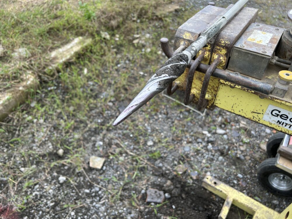 ↓先の尖った鉄の棒を刺し、地盤の硬さを調査します