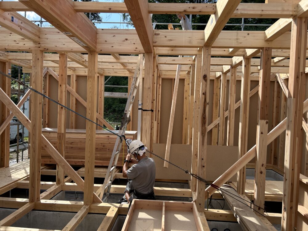 ”下げ振り(垂直を確認する道具)”を使い、柱の傾きを修正しているところです。
