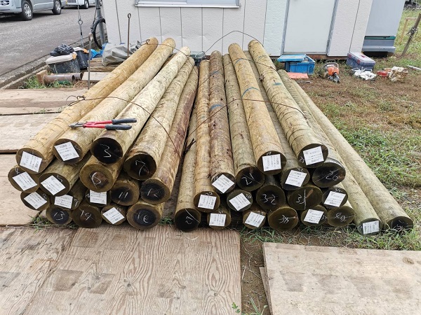 円柱状に加工した木杭を地盤に打ち込み、杭の支持力と地盤の支持力で住宅を支えます。