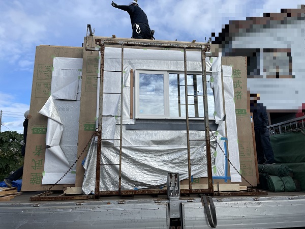 工場で、間柱・充填断熱・壁合板・防水シート・サッシの取付けまで行われています。