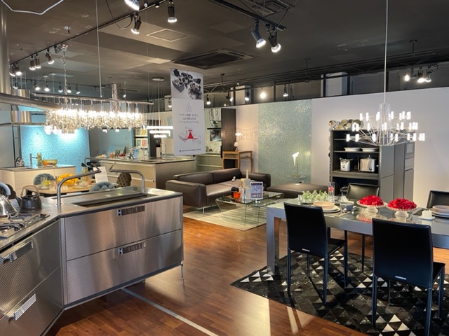↓ショールーム内は御覧のようにステンレス面材で高級感のある商品が並んでいました