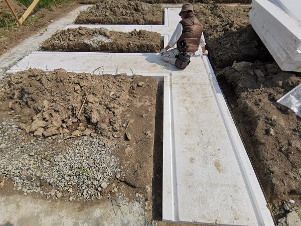 ↓先ほどの1段下がった所には、鉄筋下の断熱材が入ります