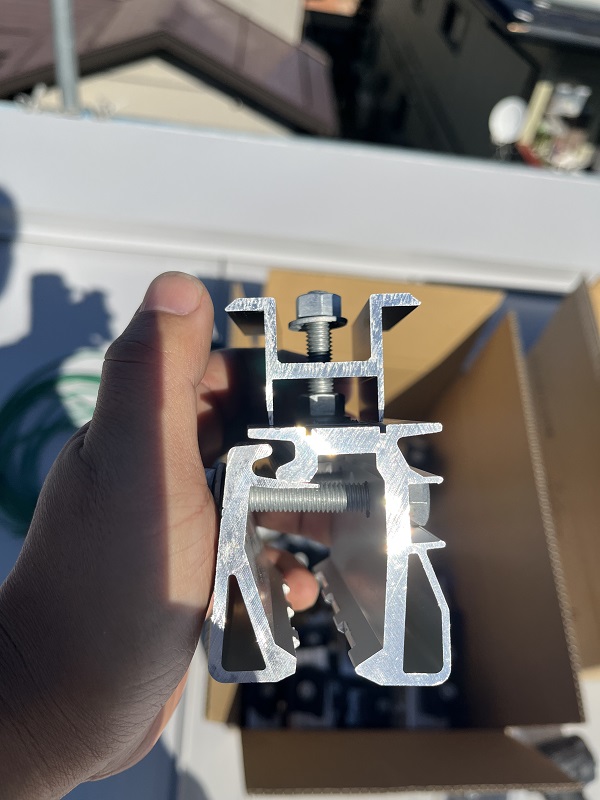 下部がクリップ状になっていて、屋根板金のハゼ部分を挟みボルトで絞め、固定します。
