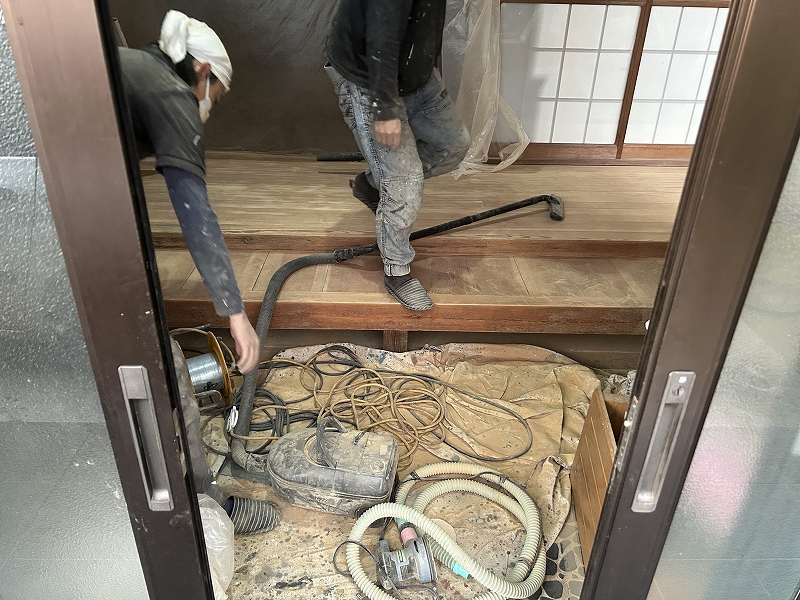 ↓初めは養生して、中でフローリングの表面をケレン(削り)ます