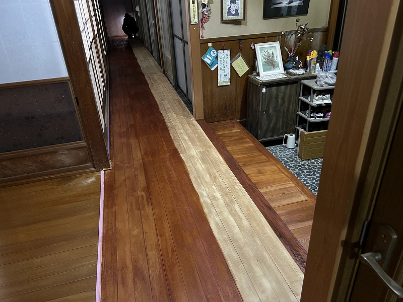 やはり、直射日光(紫外線)が当たる、廊下の外側の方が色の変化が大きいです。