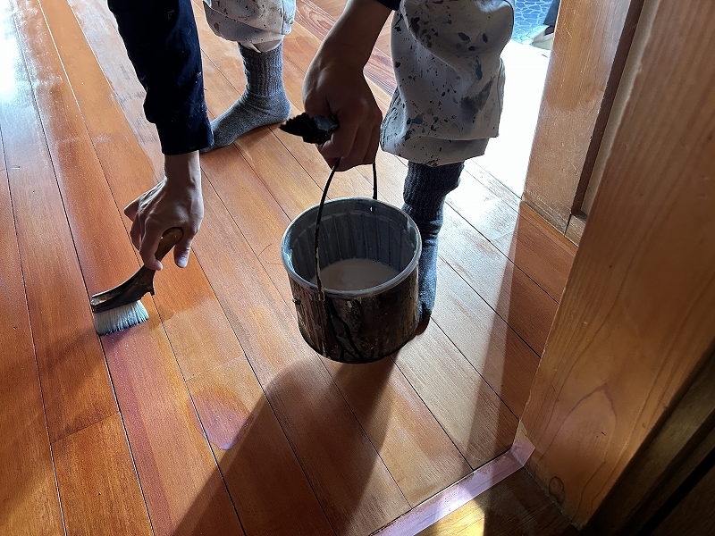 今回は匂いが気になると事前に打合せしていたので、水性塗料(オイルステイン)を塗布します。