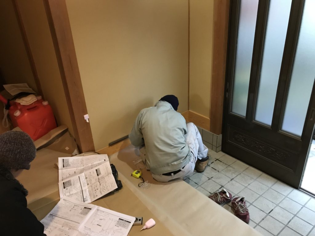 既存の下駄箱を撤去、これは壁の下地をビスを撃って確認しています。