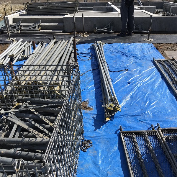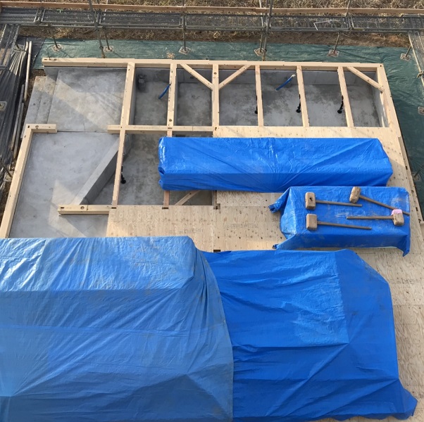 ↓材料をブルーシートで囲んで、建て方を待ちます