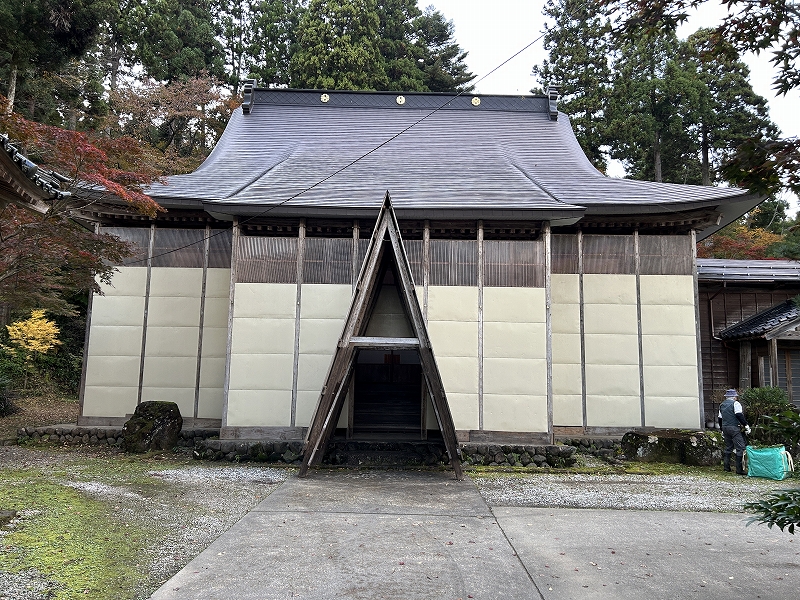 三角の骨組みは本堂への入り口部分です。