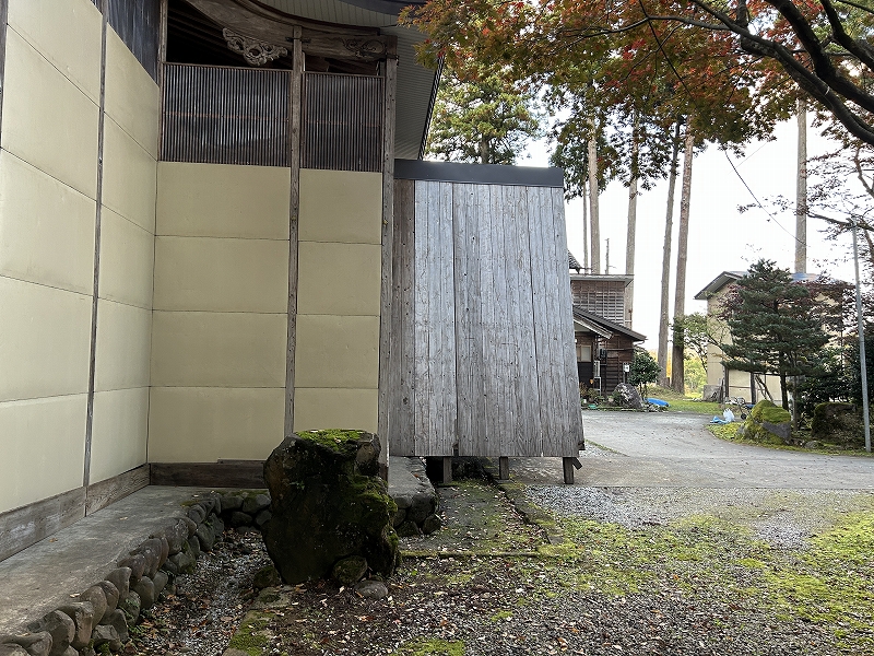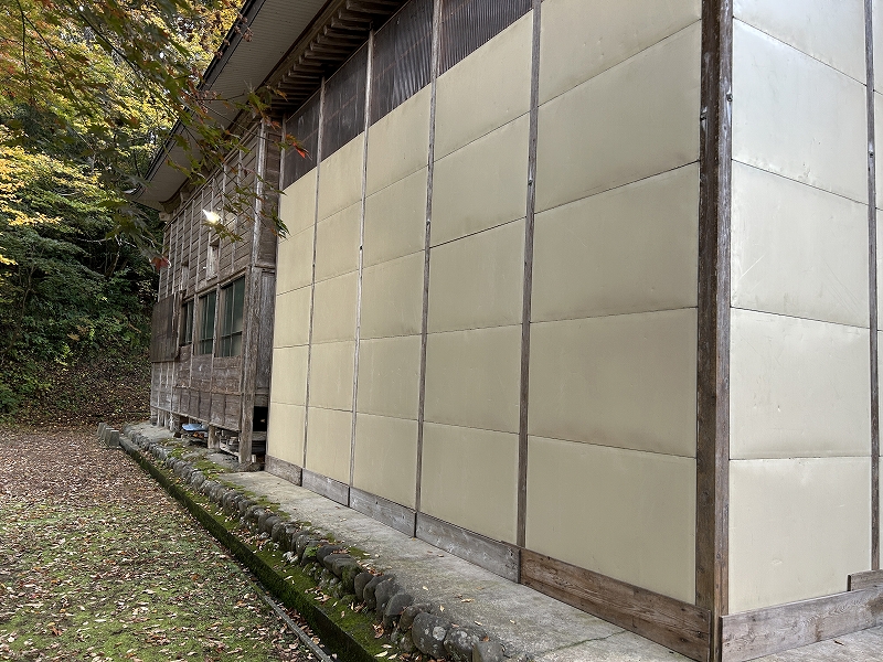 本堂の軒下に囲いパネルを取り付けます